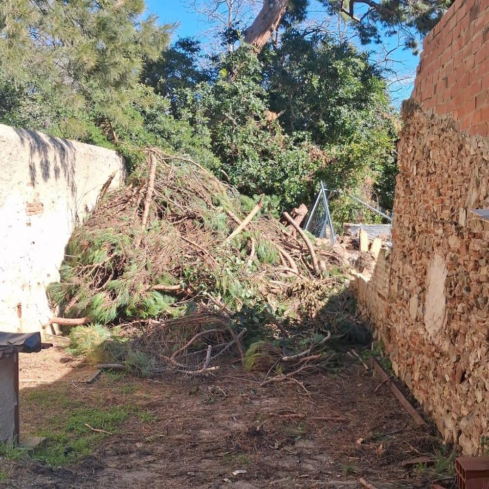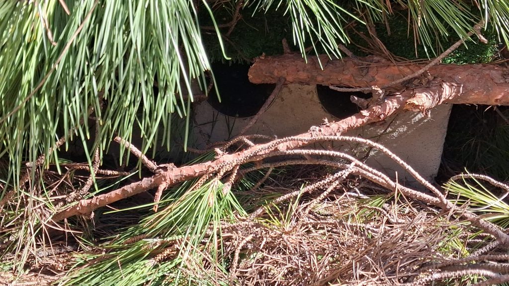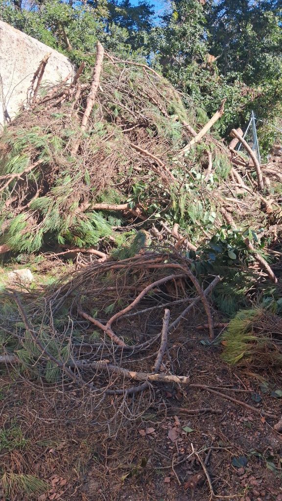 Els treballadors que estaven fent la neteja del pobre pi que el vent va fer caure, van deixar totes les branques just damunt dels refugis dels gats, sepultant-los.
