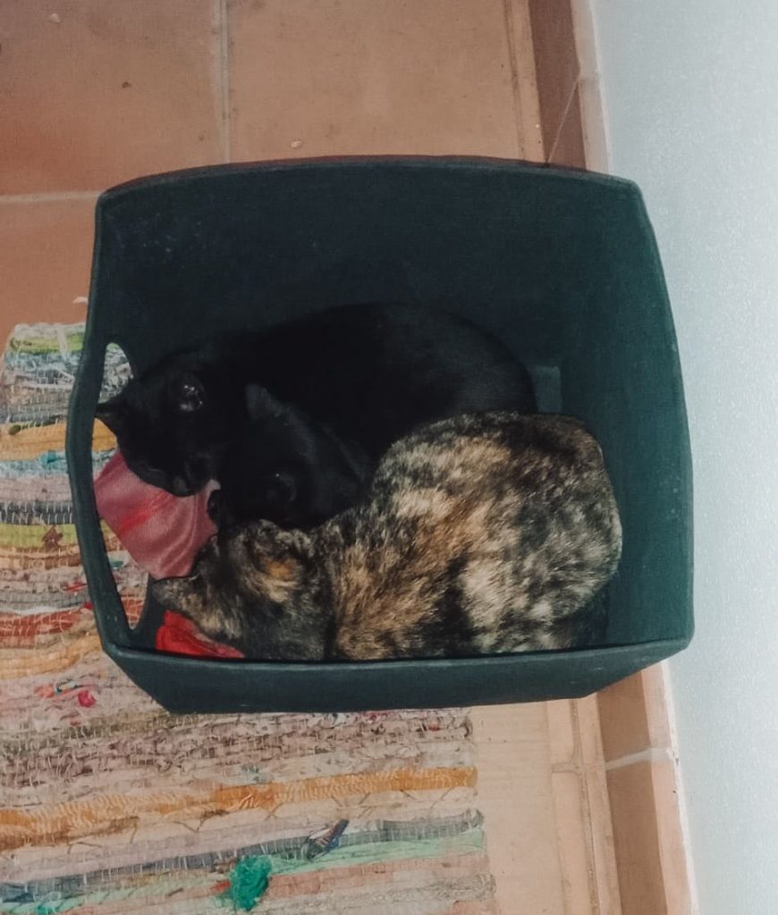 Tot va començar amb la trucada de la Victòria: al passadís de casa seva del Progrés, hi havia una gata carey amb els seus cadells. Després de les gestions amb l’Ajuntament, la mare i un dels cadells van ser capturats per esterilitzar i els van tornar al carrer. Els altres una associació els van rescatar per buscar-los família. En canvi, els dos cadells negres, un cop més, semblava que no tenien la mateixa sort.